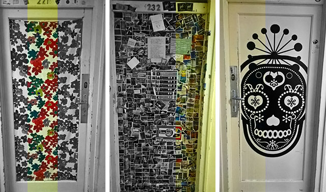 A következő alkotások a Bercsényi kollégium ajtói. A kollégiumban mind a szobákat, mind az ajtókat saját kedvünkre átalakíthatjuk, így, mint látható, eléggé elszabadult a fantázia.
